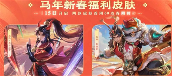 2月15日两款新春皮肤【吕布-舞狮寰】与【敖隐首款皮肤】开启60点券限时秒杀,高性价比抢购