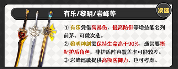 黎明神剑虽然基础白值偏低,但只要队伍中有护盾角色存在,即可享受高额的双暴击加成,其直接且高效的数值同样接近专属武器效果;