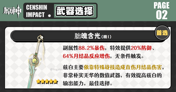 副属性提供88.2%暴击伤害,武器特效带来直接且简单的数值提升,能够增加防御力,并提高E技能后触发月结晶反应的伤害加成;
