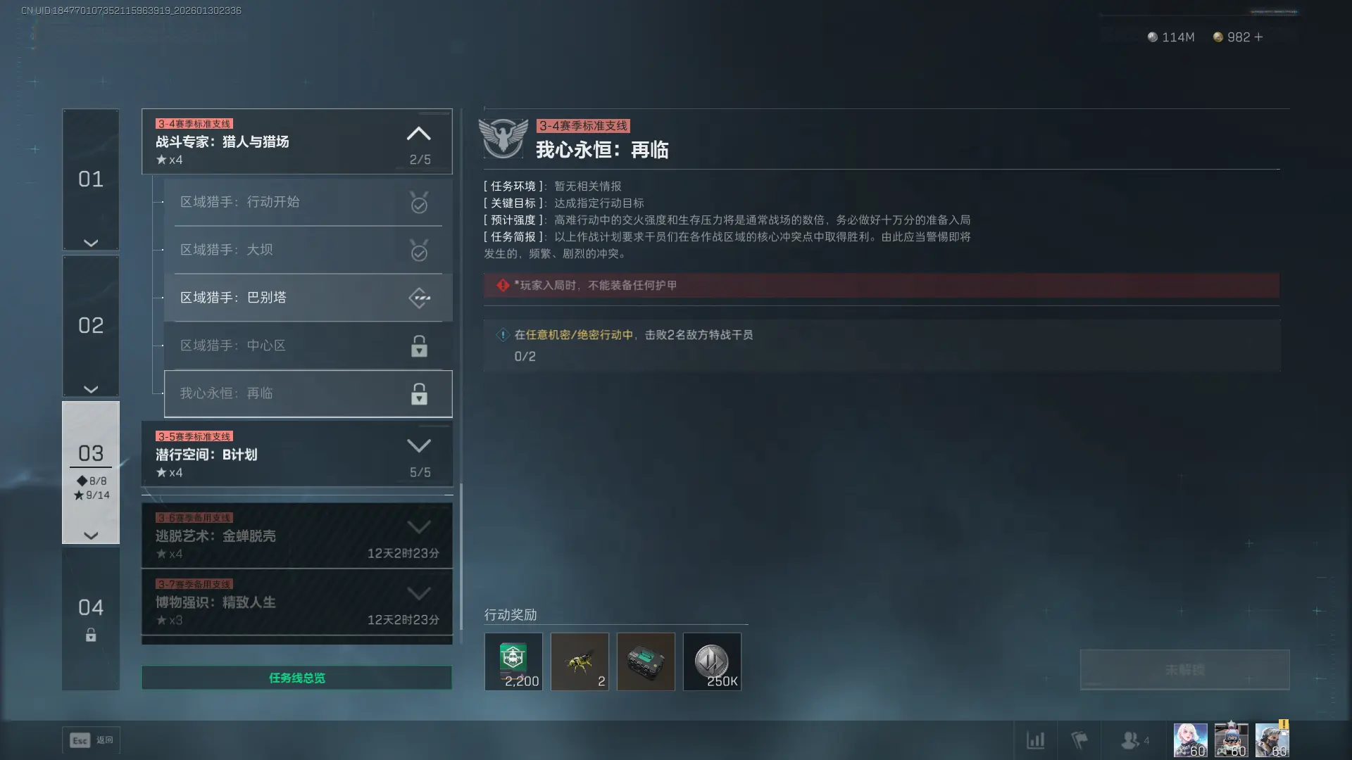 1、任务目标:在任意机密/绝密行动中,击败2名敌方特战干员。