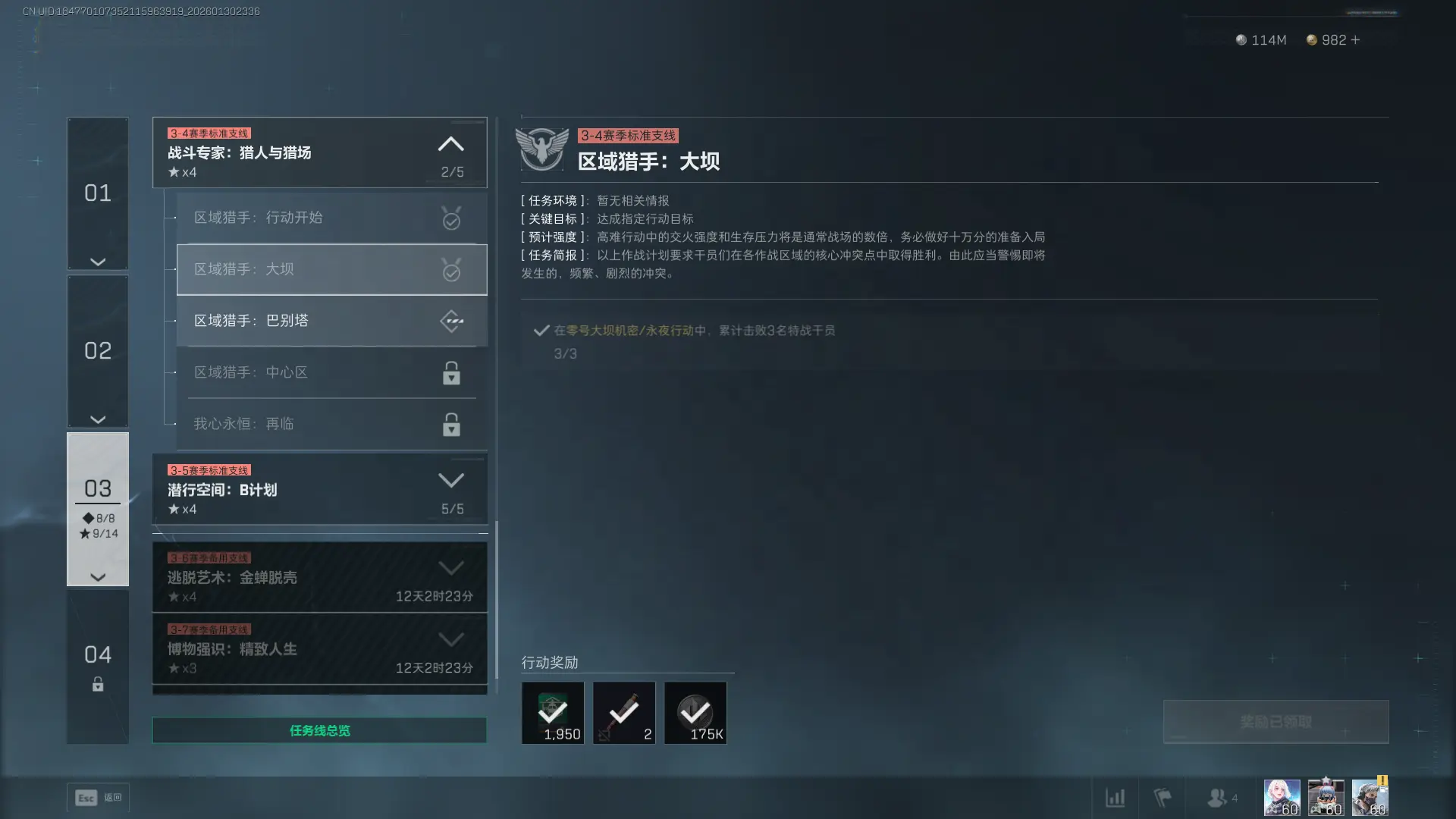 1、任务目标:在零号大坝机密/永夜行动中,累计击败3名特战干员。