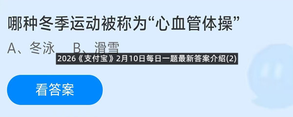 哪种冬季运动被称为“心血管体操”?这是今天《支付宝》每日一题的问题,相信我们很多用户都很想知道这个问题的答案是什么?这么一个可以领取饲料的机会相信我们很多用户都不想错过,这里羊托游小编为你带来了2026《支付宝》2月10日每日一题最新答案介绍(2)的全部内容,喜欢的小伙伴欢迎点击进入看看吧。