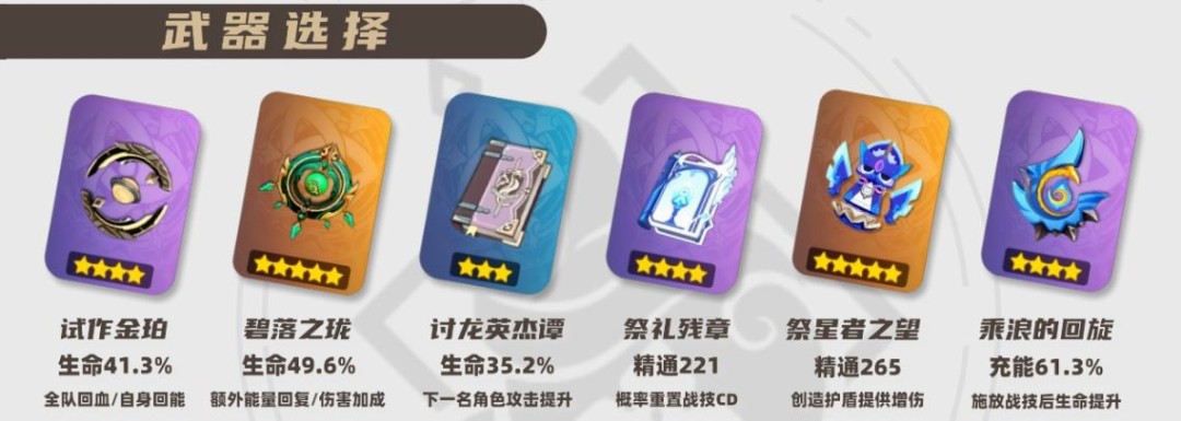 优先提升所需元素的充能效率。在大多数情况下,0命的高性价比武器可以选择精炼度较高的「试作金珀」,既能优化能量循环,又能增加白术的治疗量。如果想要进一步优化白术的能量回复,也可以考虑使用碧落之珑。