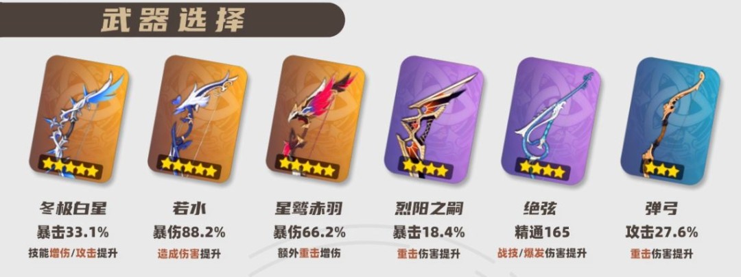 在四星武器中,推荐选择绝弦、烈阳之嗣、苍翠猎弓等几把。