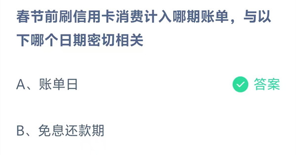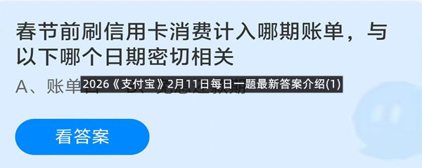 春节前刷信用卡消费计入哪期账单,与以下哪个日期密切相关?这是今天《支付宝》每日一题的问题,相信我们很多用户都很想知道这个问题的答案是什么?这么一个可以领取饲料的机会相信我们很多用户都不想错过,这里羊托游小编为你带来了2026《支付宝》2月11日每日一题最新答案介绍(1)的全部内容,喜欢的小伙伴欢迎点击进入看看吧。
