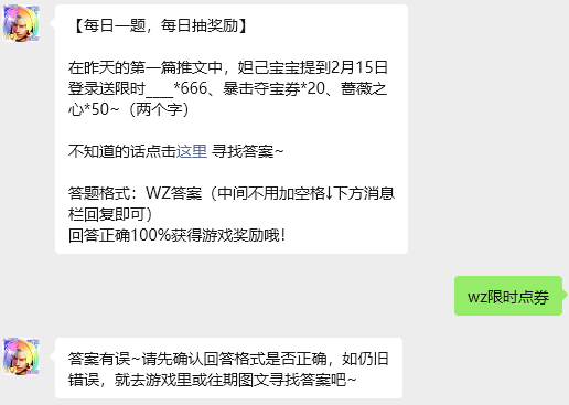 今日问题:在昨天的第一篇推文中,妲己宝宝提到2月15日登录送限时____*666、暴击夺宝券*20、蔷薇之心*50~(两个字)