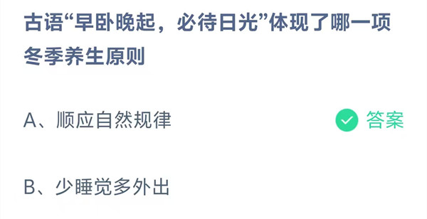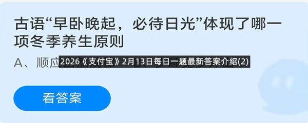 古语“早卧晚起,必待日光”体现了哪一项冬季养生原则?这是今天《支付宝》每日一题的问题,相信我们很多用户都很想知道这个问题的答案是什么?这么一个可以领取饲料的机会相信我们很多用户都不想错过,这里羊托游小编为你带来了2026《支付宝》2月13日每日一题最新答案介绍(2)的全部内容,喜欢的小伙伴欢迎点击进入看看吧。
