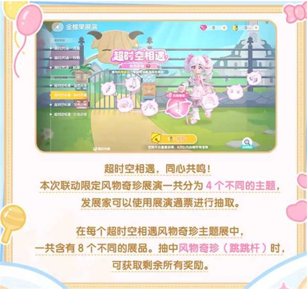 玩法机制上,本次联动展演共划分为4大主题,每个主题包含8件不同的展品。当玩家抽中“风物奇珍跳跳杆”后,可以直接获得该主题剩余的全部奖励。同时,所有宝物均不会重复获得,并且在8次以内必定集齐全部展品,保证玩家的参与体验更加顺畅。
