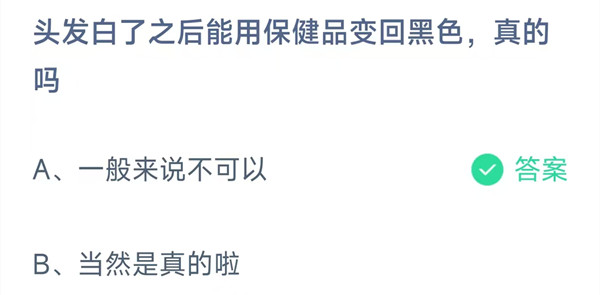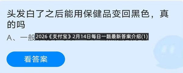 头发白了之后能用保健品变回黑色,真的吗?这是今天《支付宝》每日一题的问题,相信我们很多用户都很想知道这个问题的答案是什么?这么一个可以领取饲料的机会相信我们很多用户都不想错过,这里羊托游小编为你带来了2026《支付宝》2月14日每日一题最新答案介绍(1)的全部内容,喜欢的小伙伴欢迎点击进入看看吧。