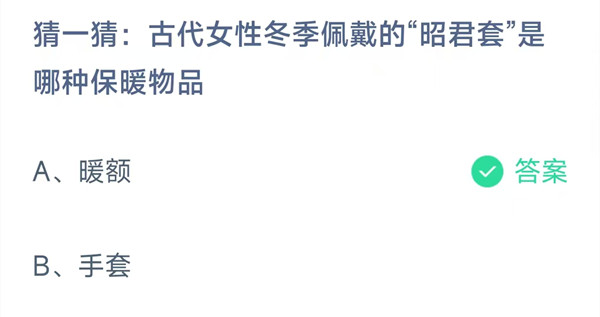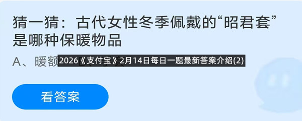 猜一猜:古代女性冬季佩戴的“昭君套”是哪种保暖物品?这是今天《支付宝》每日一题的问题,相信我们很多用户都很想知道这个问题的答案是什么?这么一个可以领取饲料的机会相信我们很多用户都不想错过,这里羊托游小编为你带来了2026《支付宝》2月14日每日一题最新答案介绍(2)的全部内容,喜欢的小伙伴欢迎点击进入看看吧。
