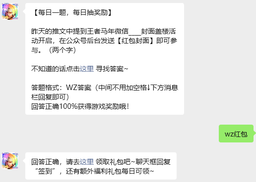 今日问题:昨天的推文中提到王者马年微信____封面盖楼活动开启,在公众号后台发送【红包封面】即可参与。(两个字)