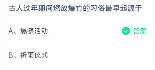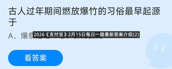 古人过年期间燃放爆竹的习俗最早起源于?这是今天《支付宝》每日一题的问题,相信我们很多用户都很想知道这个问题的答案是什么?这么一个可以领取饲料的机会相信我们很多用户都不想错过,这里羊托游小编为你带来了2026《支付宝》2月15日每日一题最新答案介绍(2)的全部内容,喜欢的小伙伴欢迎点击进入看看吧。