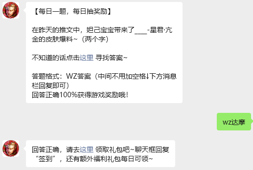 今日问题:在昨天的推文中,妲己宝宝带来了____-星君·亢金的皮肤爆料~(两个字)