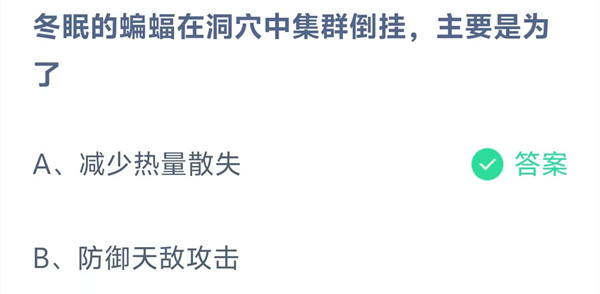 冬眠的蝙蝠在洞穴中集群倒挂,主要是为了?这是今天《支付宝》每日一题的问题,相信我们很多用户都很想知道这个问题的答案是什么?这么一个可以领取饲料的机会相信我们很多用户都不想错过,这里羊托游小编为你带来了2026《支付宝》2月28日每日一题最新答案介绍(1)的全部内容,喜欢的小伙伴欢迎点击进入看看吧。