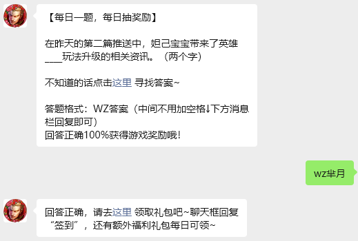 今日问题:在昨天的第二篇推送中,妲己宝宝带来了英雄____玩法升级的相关资讯。(两个字)