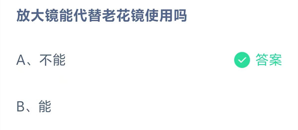 放大镜能代替老花镜使用吗?这是今天《支付宝》每日一题的问题,相信我们很多用户都很想知道这个问题的答案是什么?这么一个可以领取饲料的机会相信我们很多用户都不想错过,这里羊托游小编为你带来了2026《支付宝》3月1日每日一题最新答案介绍(1)的全部内容,喜欢的小伙伴欢迎点击进入看看吧。