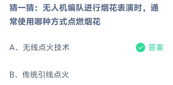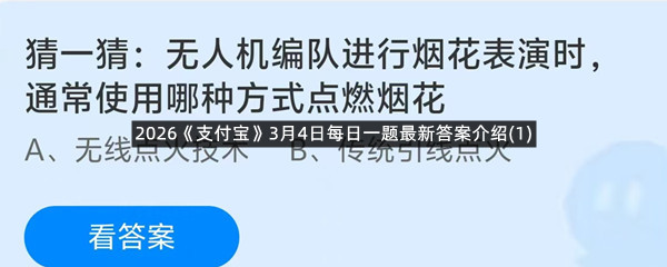 猜一猜:无人机编队进行烟花表演时,通常使用哪种方式来点燃烟花?这是今天《支付宝》每日一题的问题,相信我们很多用户都很想知道这个问题的答案是什么?这么一个可以领取饲料的机会相信我们很多用户都不想错过,这里羊托游小编为你带来了2026《支付宝》3月4日每日一题最新答案介绍(1)的全部内容,喜欢的小伙伴欢迎点击进入看看吧。