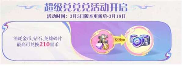 活动内容:玩家可使用金币、钻石或英雄碎片进行兑换,最高可兑换210星币。