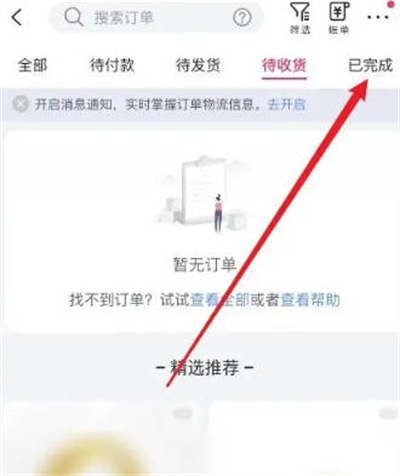 进入“待收货”页面后,找到最右侧的“已完成”选项,如图所示点击进入。