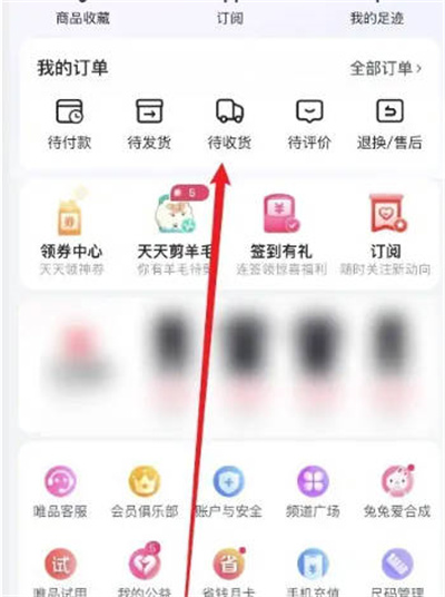 打开唯品会软件后,找到并点击页面中的“待收货”功能,如图所示进入该界面。