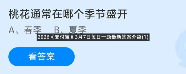 桃花通常在那个季节盛开?这是今天《支付宝》每日一题的问题,相信我们很多用户都很想知道这个问题的答案是什么?这么一个可以领取饲料的机会相信我们很多用户都不想错过,这里羊托游小编为你带来了2026《支付宝》3月7日每日一题最新答案介绍(1)的全部内容,喜欢的小伙伴欢迎点击进入看看吧。