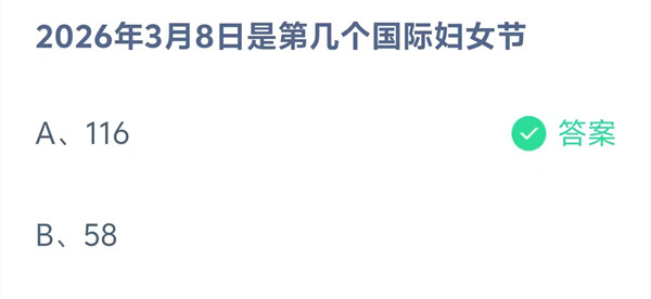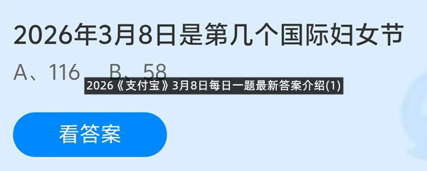 2026年3月8日是第几个国际妇女节?这是今天《支付宝》每日一题的问题,相信我们很多用户都很想知道这个问题的答案是什么?这么一个可以领取饲料的机会相信我们很多用户都不想错过,这里羊托游小编为你带来了2026《支付宝》3月8日每日一题最新答案介绍(1)的全部内容,喜欢的小伙伴欢迎点击进入看看吧。