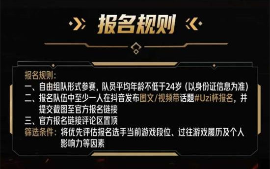 报名需完成指定任务:报名队伍中至少有1名队员,在抖音平台发布带有#Uzi杯报名 话题的图文或视频内容,并将发布截图提交至官方报名链接。