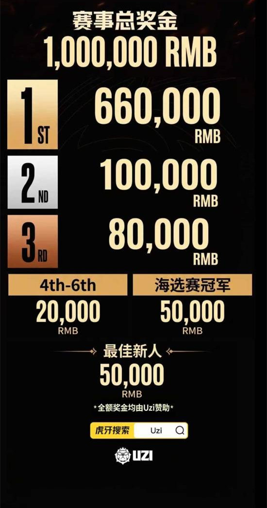 本届Uzi杯总奖金高达100万元,奖金由Uzi选手全额赞助,奖项设置丰富,激励每一位参赛选手全力以赴:
