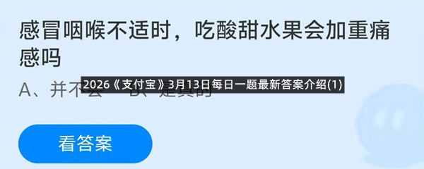 感冒咽喉不适时,吃酸甜水果会加重痛感吗?这是今天《支付宝》每日一题的问题,相信我们很多用户都很想知道这个问题的答案是什么?这么一个可以领取饲料的机会相信我们很多用户都不想错过,这里羊托游小编为你带来了2026《支付宝》3月13日每日一题最新答案介绍(1)的全部内容,喜欢的小伙伴欢迎点击进入看看吧。