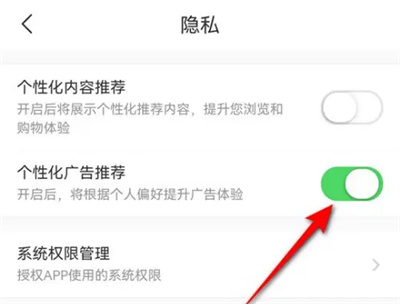 3、在隐私页面中,可以看到“个性化广告推荐”选项,后面有一个开关按钮,点击圆形滑块即可进行开启或关闭的设置。