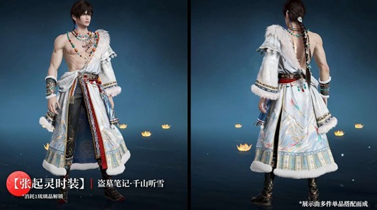 告别熟悉的卫衣和兜帽,张起灵换上厚重的藏式长袍,将《盗墓笔记》中神秘的雪域风情带入永劫战场。