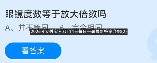眼镜度数等于放大倍数吗?这是今天《支付宝》每日一题的问题,相信我们很多用户都很想知道这个问题的答案是什么?这么一个可以领取饲料的机会相信我们很多用户都不想错过,这里羊托游小编为你带来了2026《支付宝》3月14日每日一题最新答案介绍(2)的全部内容,喜欢的小伙伴欢迎点击进入看看吧。