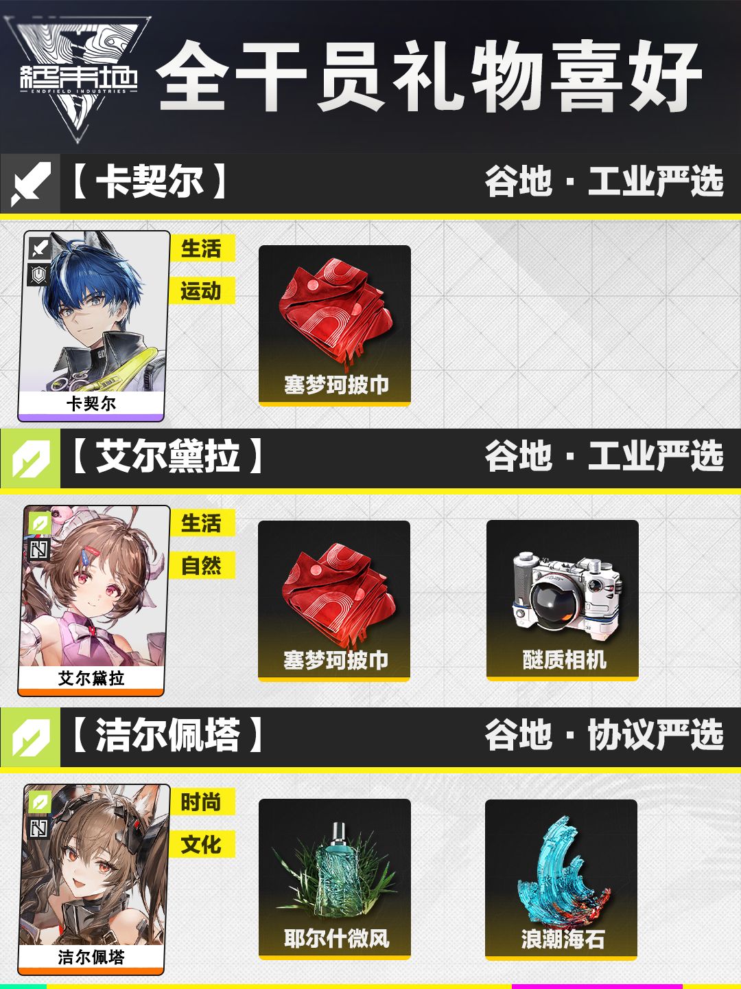 以上就是羊托游小编为你带来的《明日方舟:终末地》全角色礼物喜好汇总的全部内容,更多精彩游戏资讯攻略尽在羊托游手游网,感兴趣的小伙伴欢迎点击关注收藏本网站哦。