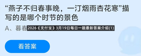 “燕子不归春事晚,一汀烟雨杏花寒”描写的是哪个时节的景色?这是今天《支付宝》每日一题的问题,相信我们很多用户都很想知道这个问题的答案是什么?这么一个可以领取饲料的机会相信我们很多用户都不想错过,这里羊托游小编为你带来了2026《支付宝》3月19日每日一题最新答案介绍(1)的全部内容,喜欢的小伙伴欢迎点击进入看看吧。