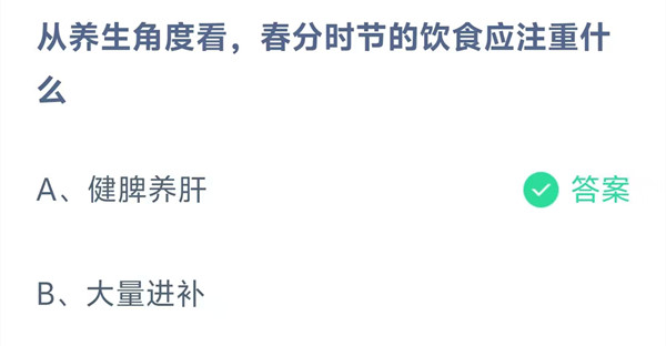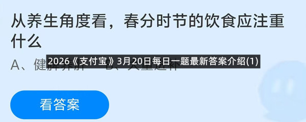 从养生角度看,春分时节的饮食应注重什么?这是今天《支付宝》每日一题的问题,相信我们很多用户都很想知道这个问题的答案是什么?这么一个可以领取饲料的机会相信我们很多用户都不想错过,这里羊托游小编为你带来了2026《支付宝》3月20日每日一题最新答案介绍(1)的全部内容,喜欢的小伙伴欢迎点击进入看看吧。