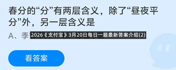春分的“分”有两层含义,除了“昼夜平分”外,另一层含义是?这是今天《支付宝》每日一题的问题,相信我们很多用户都很想知道这个问题的答案是什么?这么一个可以领取饲料的机会相信我们很多用户都不想错过,这里羊托游小编为你带来了2026《支付宝》3月20日每日一题最新答案介绍(2)的全部内容,喜欢的小伙伴欢迎点击进入看看吧。