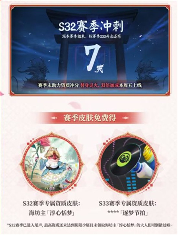 随着S33赛季逐步临近,S32赛季也进入最后冲刺阶段,专属资质皮肤海坊主「淳心恬梦」即将下架。尚未获取该皮肤的大人们请尽快行动,以免错过收藏机会。