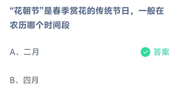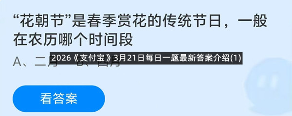 “花朝节”是春季赏花的传统节日,一般在农历哪个时间段?这是今天《支付宝》每日一题的问题,相信我们很多用户都很想知道这个问题的答案是什么?这么一个可以领取饲料的机会相信我们很多用户都不想错过,这里羊托游小编为你带来了2026《支付宝》3月21日每日一题最新答案介绍(1)的全部内容,喜欢的小伙伴欢迎点击进入看看吧。