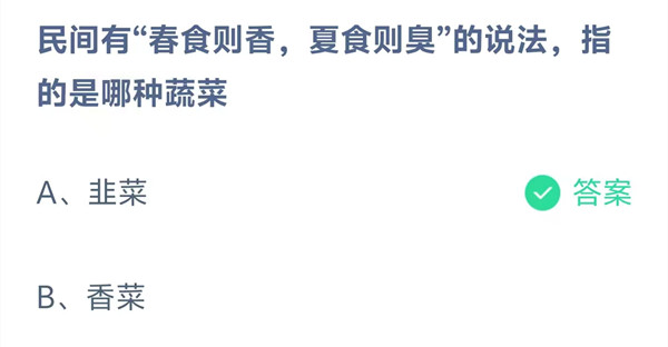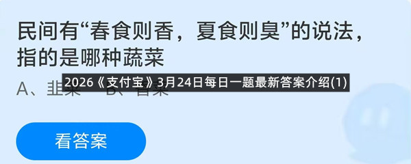 民间有“春食则香,夏食则臭”的说法,指的是哪种蔬菜?这是今天《支付宝》每日一题的问题,相信我们很多用户都很想知道这个问题的答案是什么?这么一个可以领取饲料的机会相信我们很多用户都不想错过,这里羊托游小编为你带来了2026《支付宝》3月24日每日一题最新答案介绍(1)的全部内容,喜欢的小伙伴欢迎点击进入看看吧。