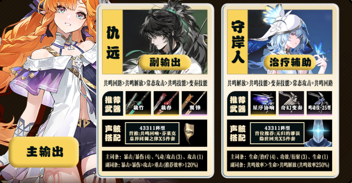 仇远:提供50%声骸技能伤害加深(持续14秒)并叠加全队暴击伤害,同时配合西格莉卡被动,实现“互拐”增益。