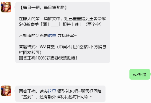 今日问题:在昨天的第一篇推文中,妲己宝宝提到王者荣耀S43新赛季「陌上____」即将上线!(两个字)