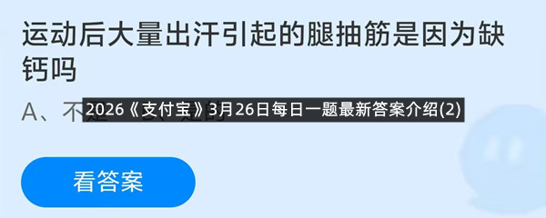 运动后大量出汗引起的腿抽筋是因为缺钙吗?这是今天《支付宝》每日一题的问题,相信我们很多用户都很想知道这个问题的答案是什么?这么一个可以领取饲料的机会相信我们很多用户都不想错过,这里羊托游小编为你带来了2026《支付宝》3月26日每日一题最新答案介绍(2)的全部内容,喜欢的小伙伴欢迎点击进入看看吧。