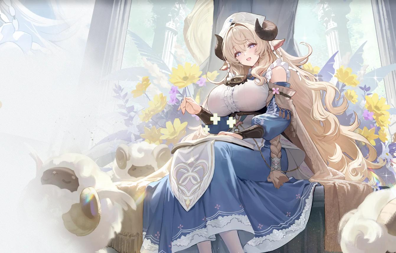 她头顶有一对深棕色的弯角和一对羊耳,这是兽人族典型特征,看起来既软萌又极具辨识度。金色长发搭配侧边麻花辫,温柔的紫色眼眸加上略带慵懒的表情,让她整体亲和力满满。服饰方面是蓝白相间的护士风长裙,蕾丝花边和精致刺绣相辅相成,既复古又优雅,非常符合护理师的身份设定。
