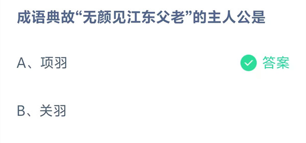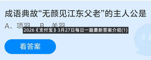 成语典故“无颜见江东父老”的主人公是?这是今天《支付宝》每日一题的问题,相信我们很多用户都很想知道这个问题的答案是什么?这么一个可以领取饲料的机会相信我们很多用户都不想错过,这里羊托游小编为你带来了2026《支付宝》3月27日每日一题最新答案介绍(1)的全部内容,喜欢的小伙伴欢迎点击进入看看吧。