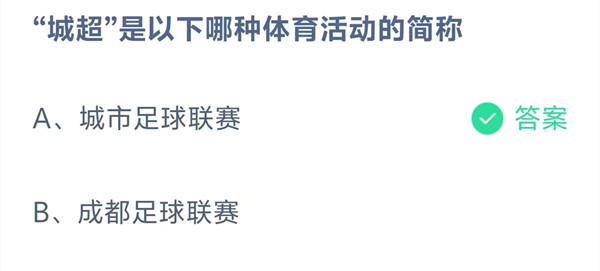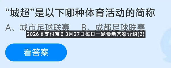 “城超”是以下哪种体育活动的简称?这是今天《支付宝》每日一题的问题,相信我们很多用户都很想知道这个问题的答案是什么?这么一个可以领取饲料的机会相信我们很多用户都不想错过,这里羊托游小编为你带来了2026《支付宝》3月27日每日一题最新答案介绍(2)的全部内容,喜欢的小伙伴欢迎点击进入看看吧。