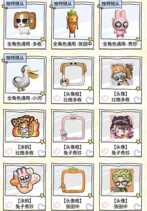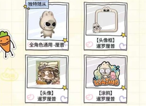 已购买同系列其他联动时装的玩家(如【奇珍时装】“囚徒”-比格多栋、调酒师-兔子秀珍、律师-张田中、小丑-鹈鹕小河)在完成对应行盲盒全开启条件时,还可额外领取该时装专属的随从、头像框、头像和涂鸦奖励。