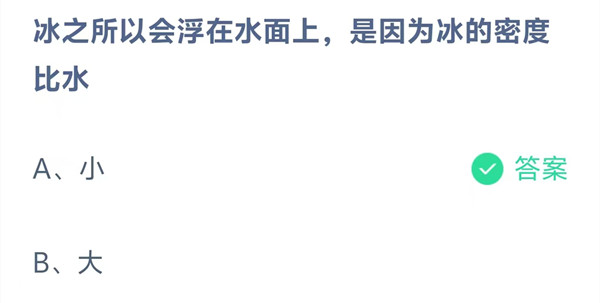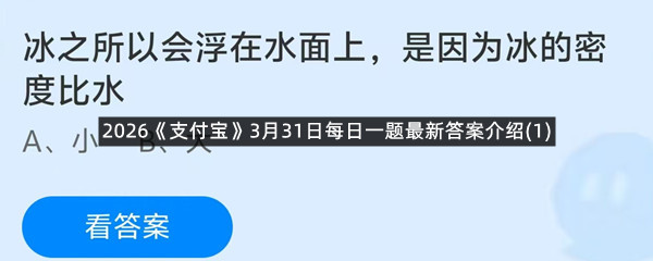 冰之所以会浮在水面上,是因为冰的密度比水?这是今天《支付宝》每日一题的问题,相信我们很多用户都很想知道这个问题的答案是什么?这么一个可以领取饲料的机会相信我们很多用户都不想错过,这里羊托游小编为你带来了2026《支付宝》3月31日每日一题最新答案介绍(1)的全部内容,喜欢的小伙伴欢迎点击进入看看吧。
