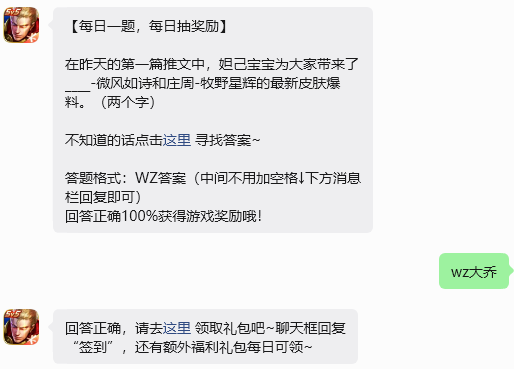 今日问题:在昨天的第一篇推文中,妲己宝宝为大家带来了____-微风如诗和庄周-牧野星辉的最新皮肤爆料。(两个字)
