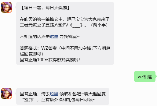 今日问题:在昨天的第一篇推文中,妲己宝宝为大家带来了王者元流之子五路齐聚PV《____》。(两个字)