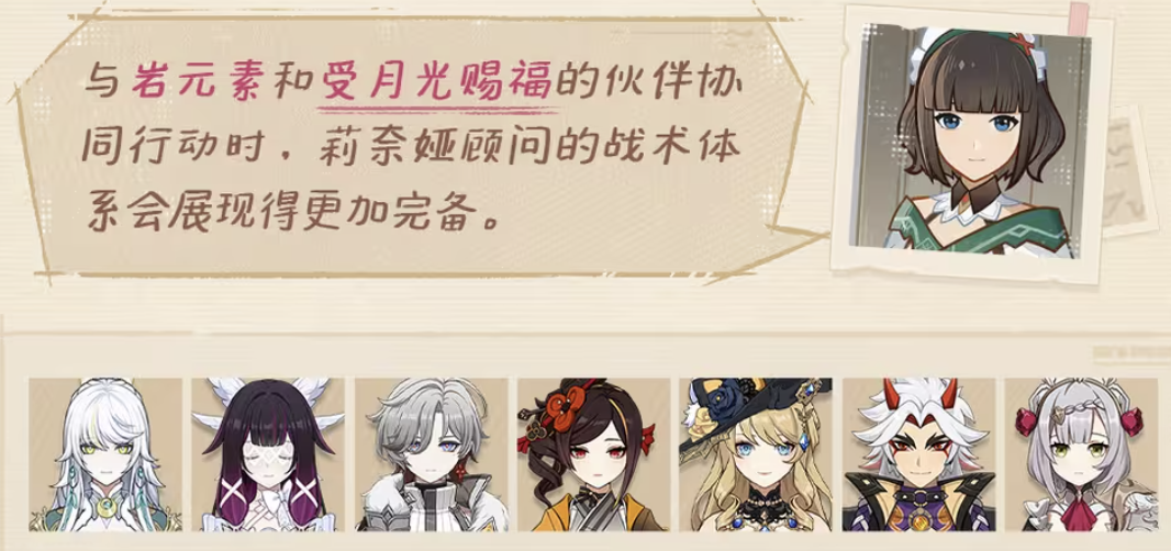 首先了解莉奈娅的定位:莉奈娅是一位集岩元素减抗、全队治疗、后台持续伤害为一体的全能辅助。